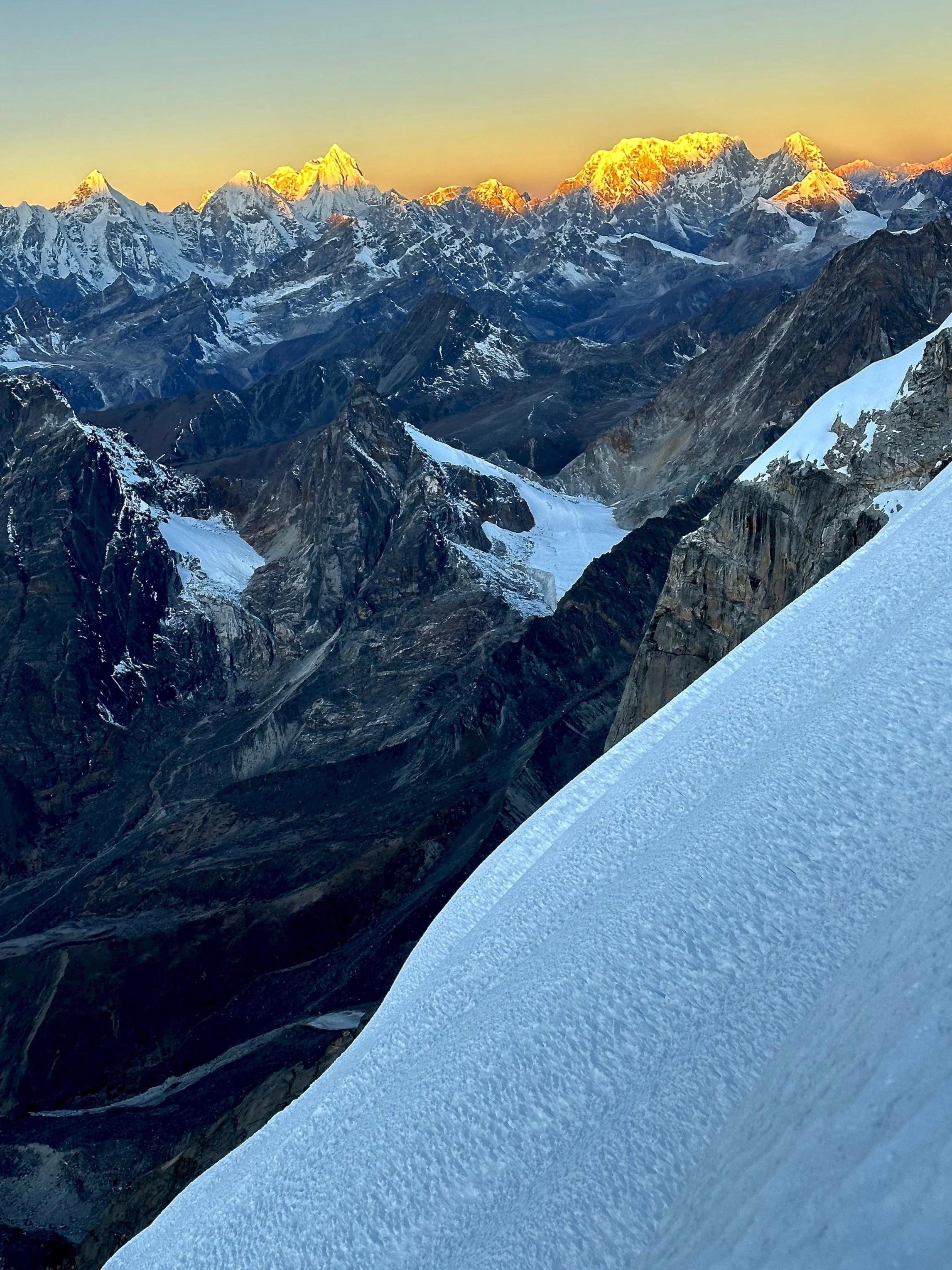 Summit Ridge. The first rays of sun emerging from behind Makalu (left). From left to right: Baruntse, Chamlang, Ama Dablam.