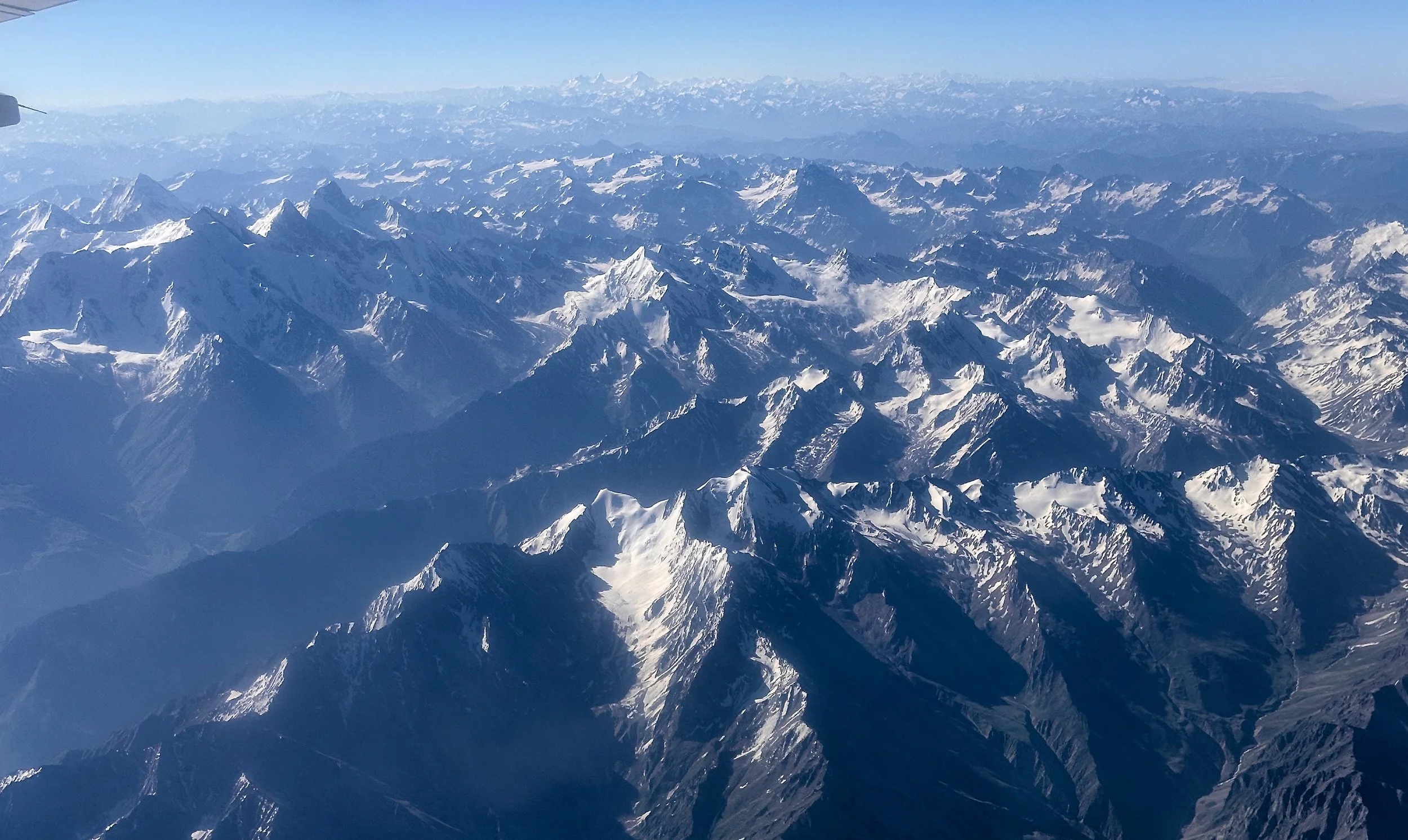 The entire Mazeno Ridge is visible here. The Mazeno Gap (a cleft between the Mazeno Ridge and the Upper Nanga Parbat) is on the left. The 5,400m high Mazeno Pass is dwarfed by the enormity of the terrain. It is on the centre-right side of the photo. The view from the Islamabad - Skardu flight.