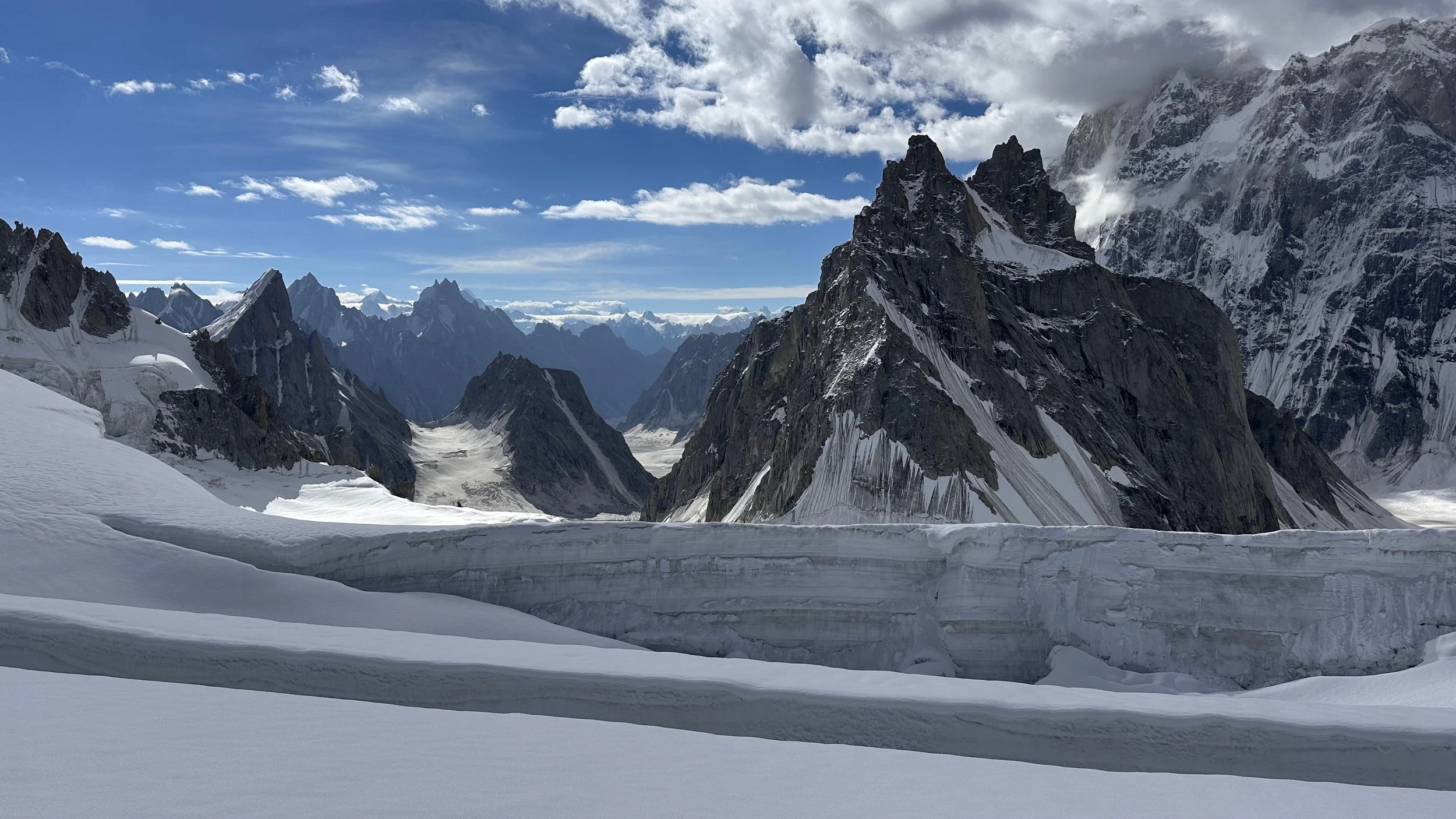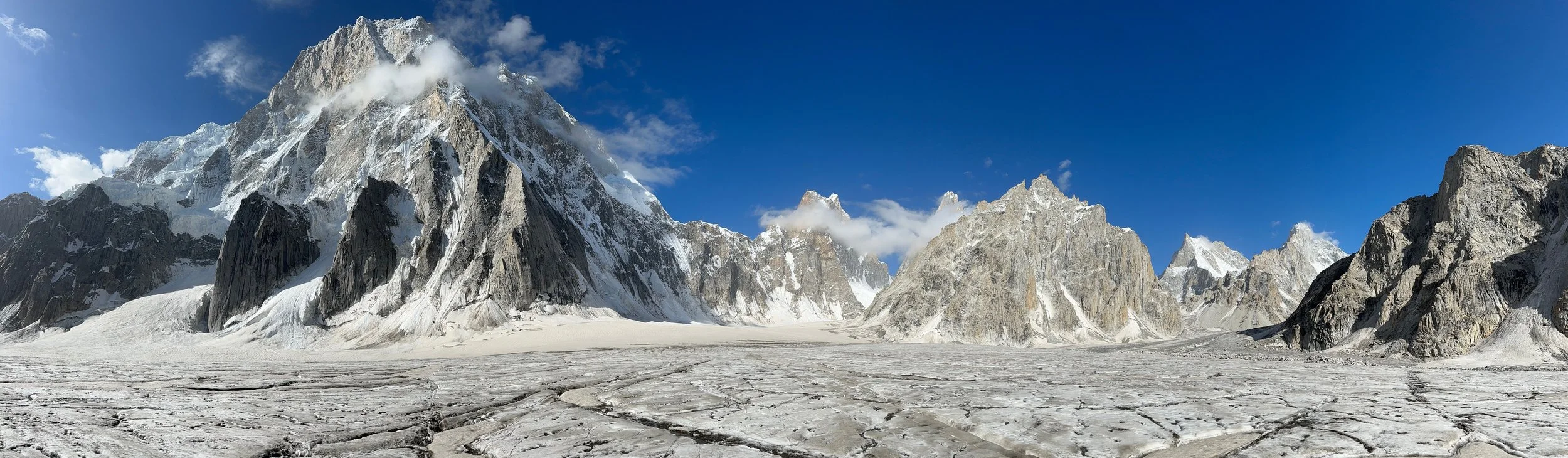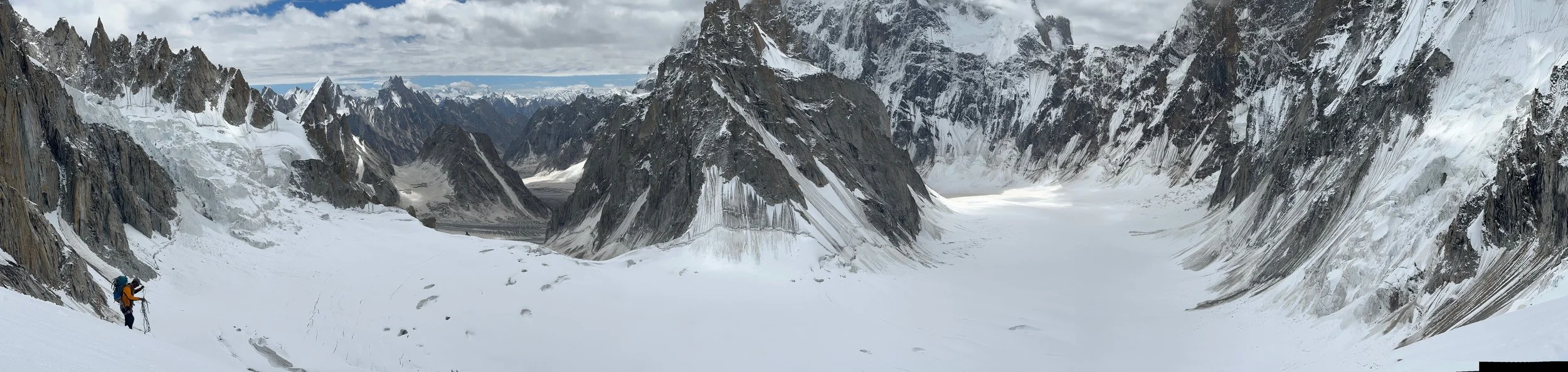 An overview of the Sim Gang Glacier and the Ogre. Even Broad Peak is visible on the horizon.