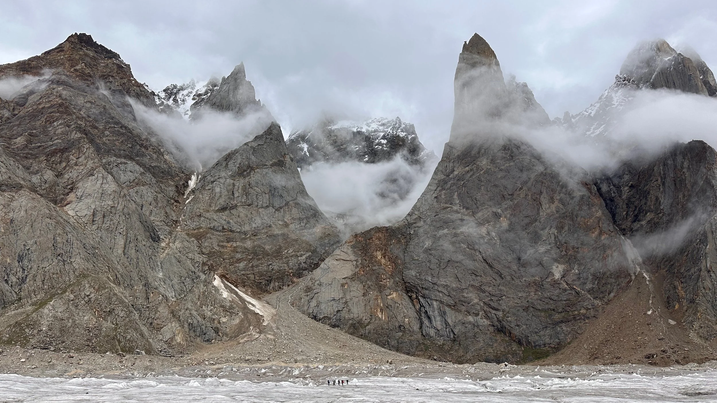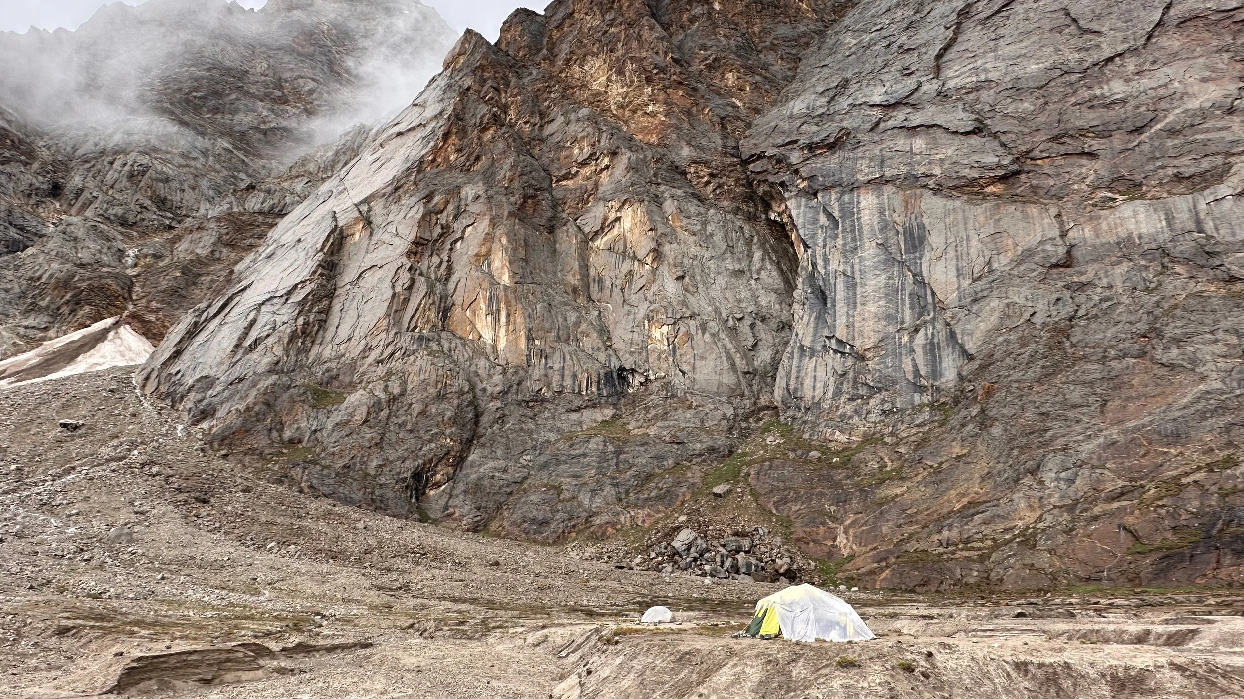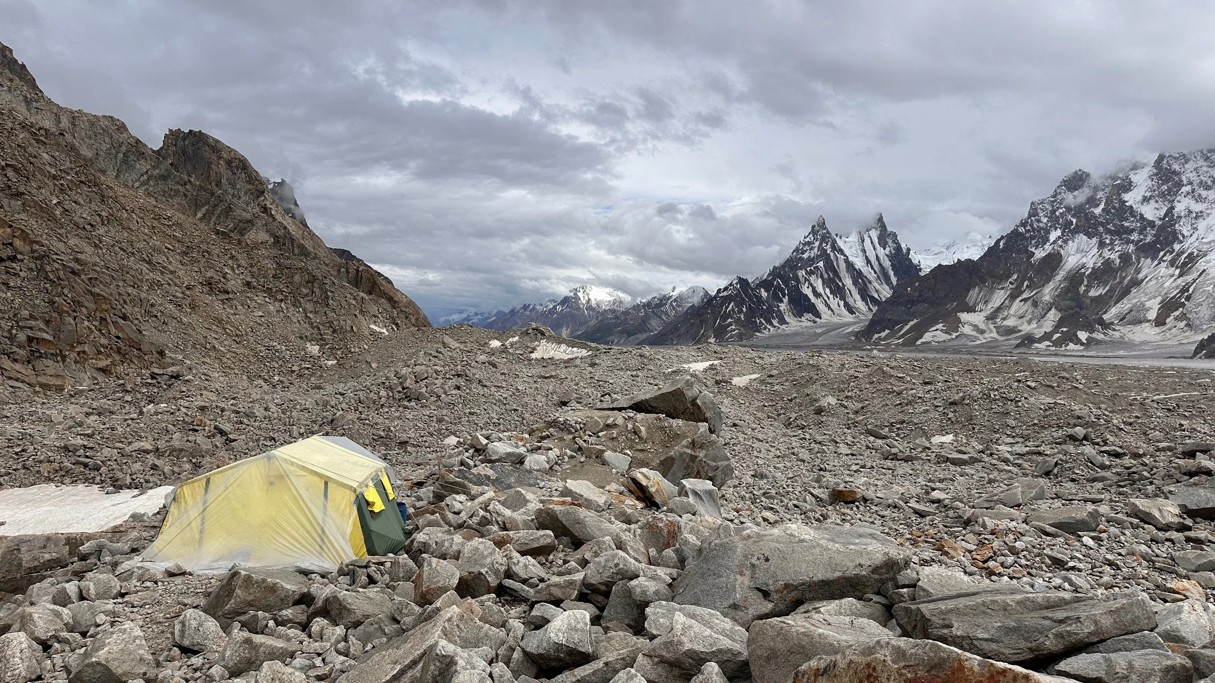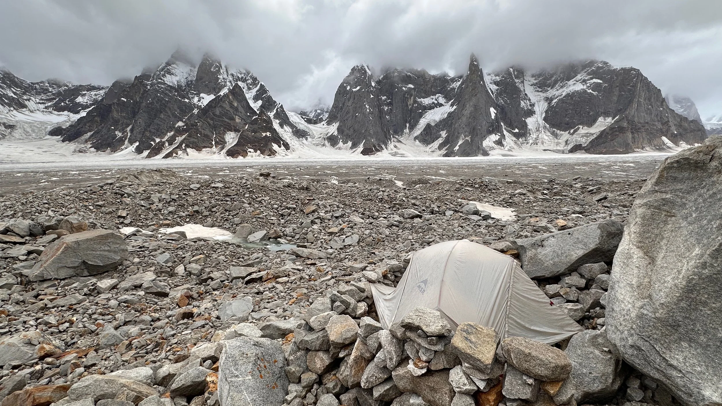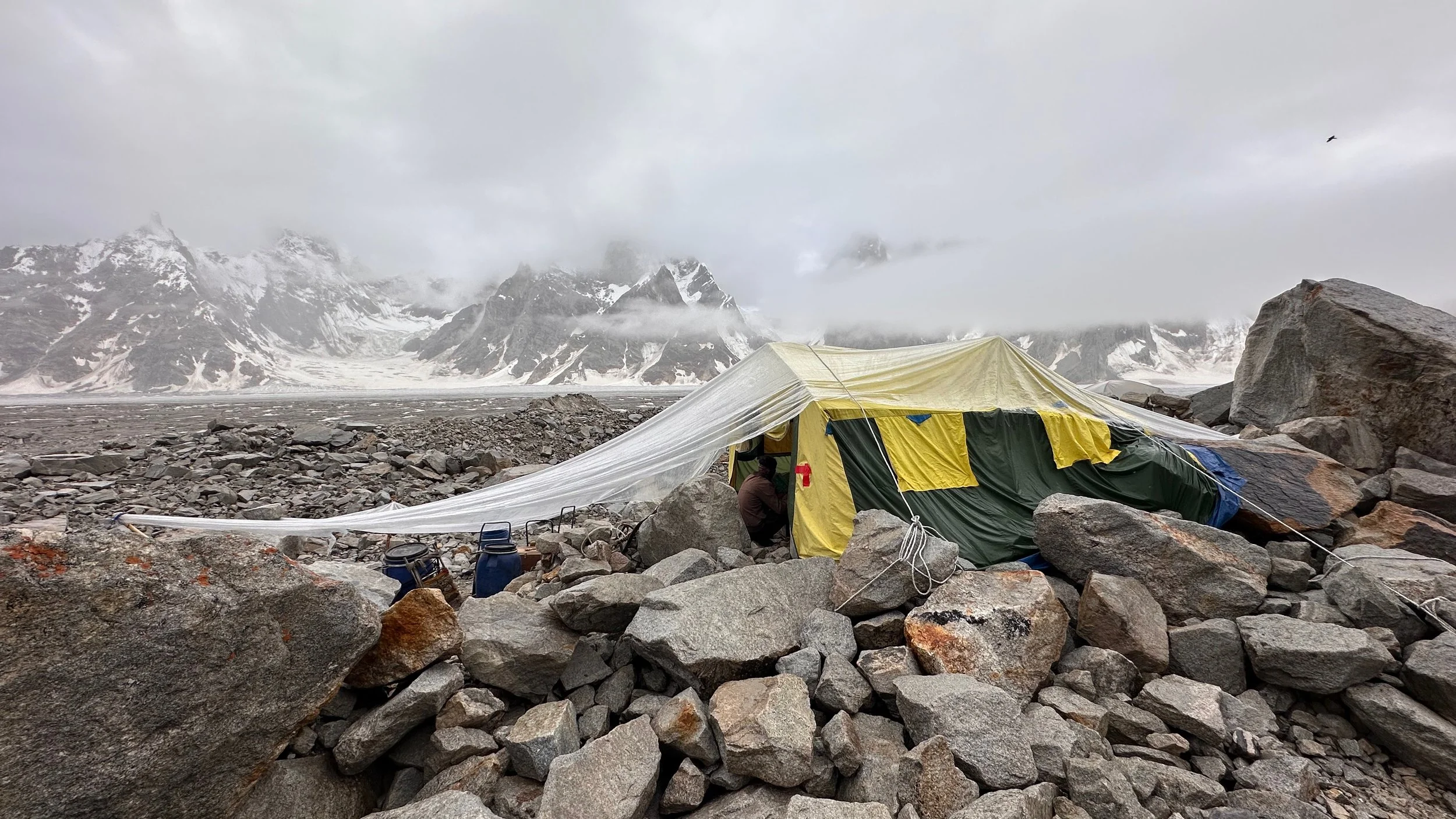Dwarfed by the spires of the Biafo - our small camp in the rain. It rained continuously for 3 days.