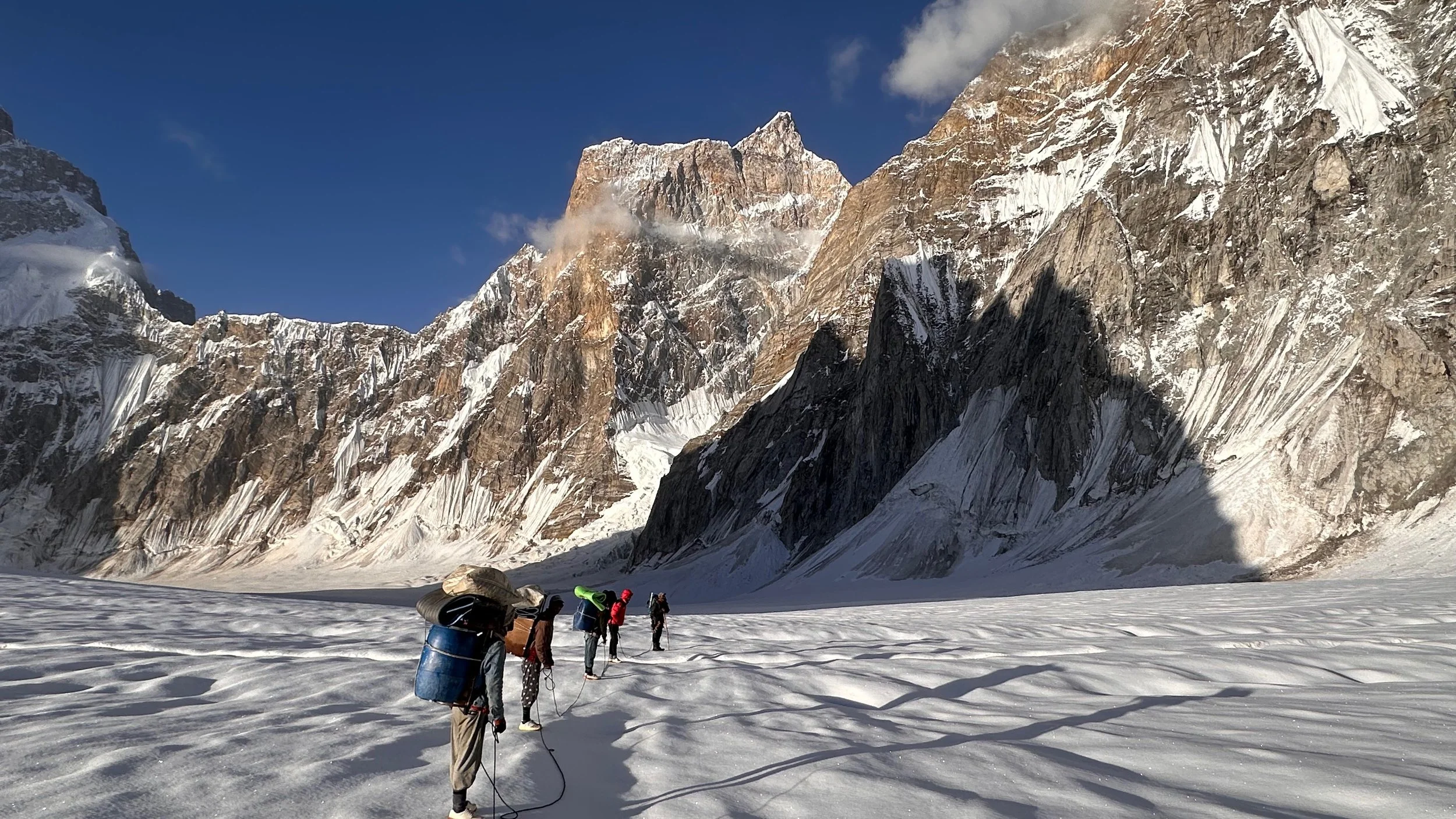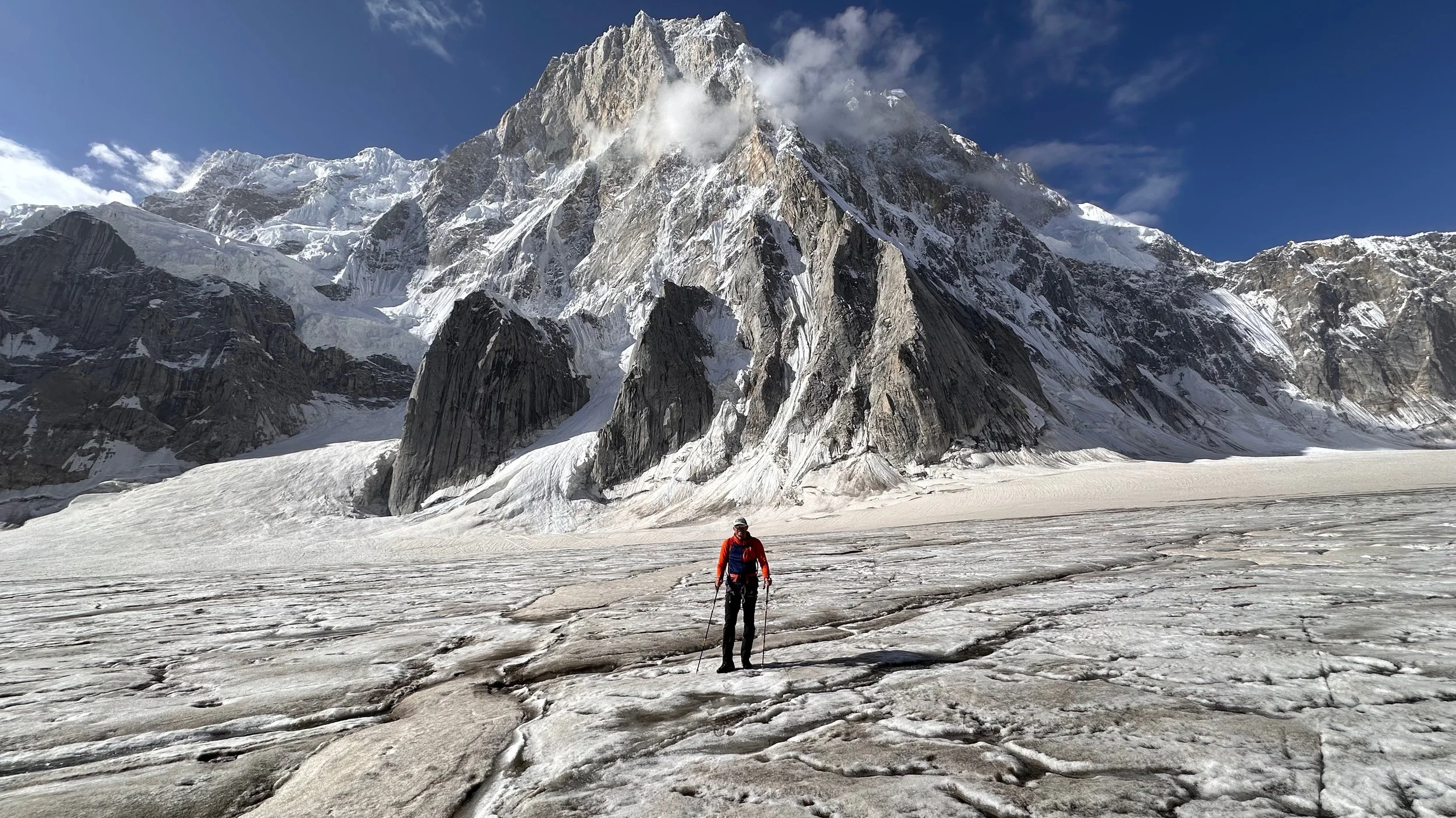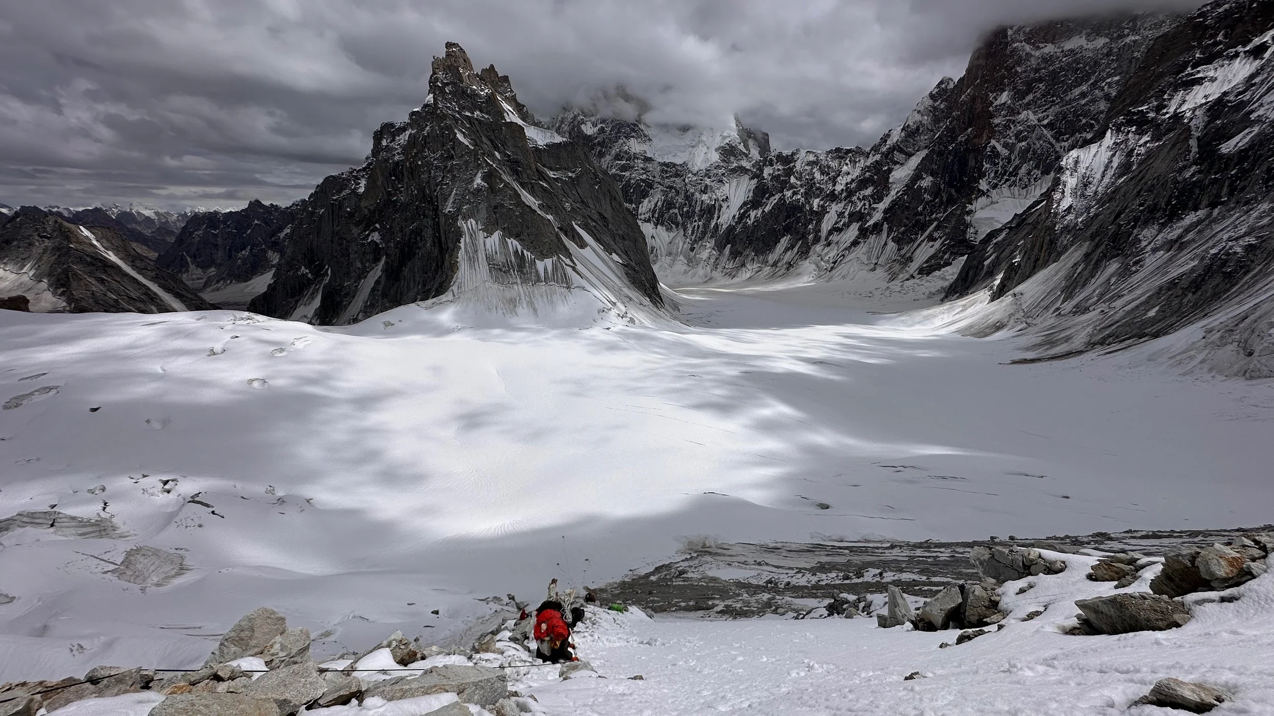 Looking for a way across the pass with Baintha Kabatha 6.270m towering above.