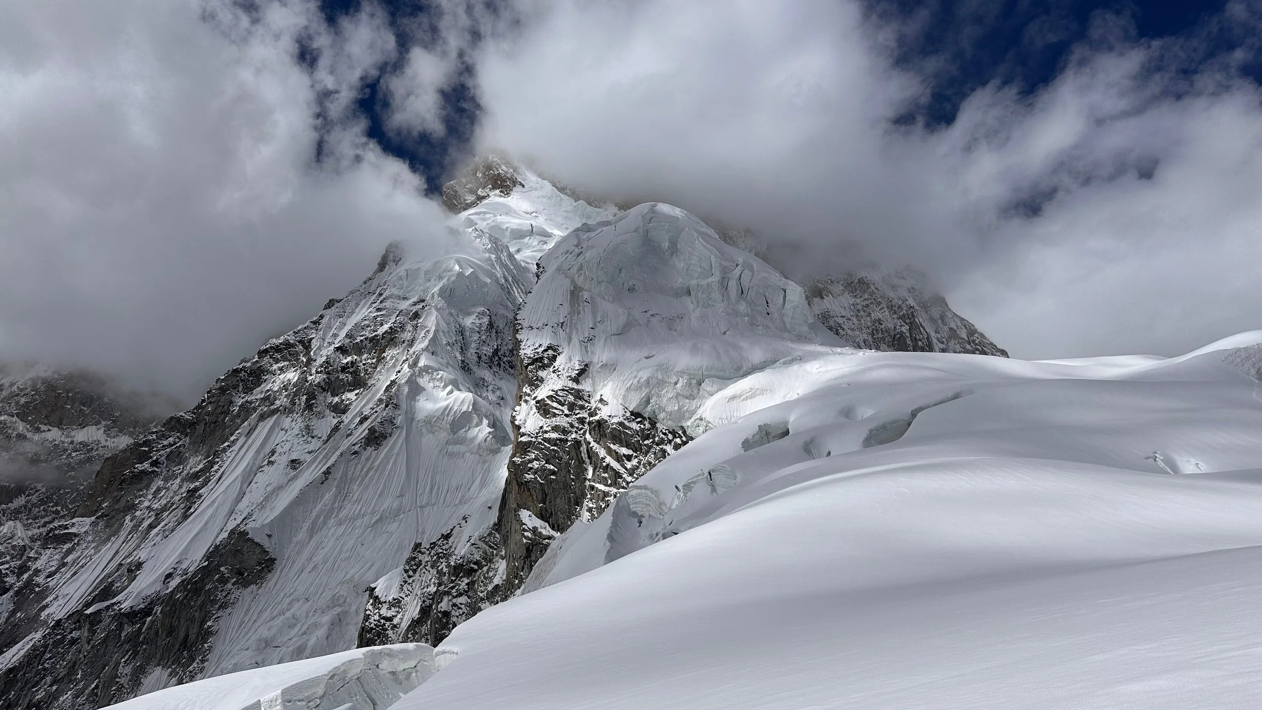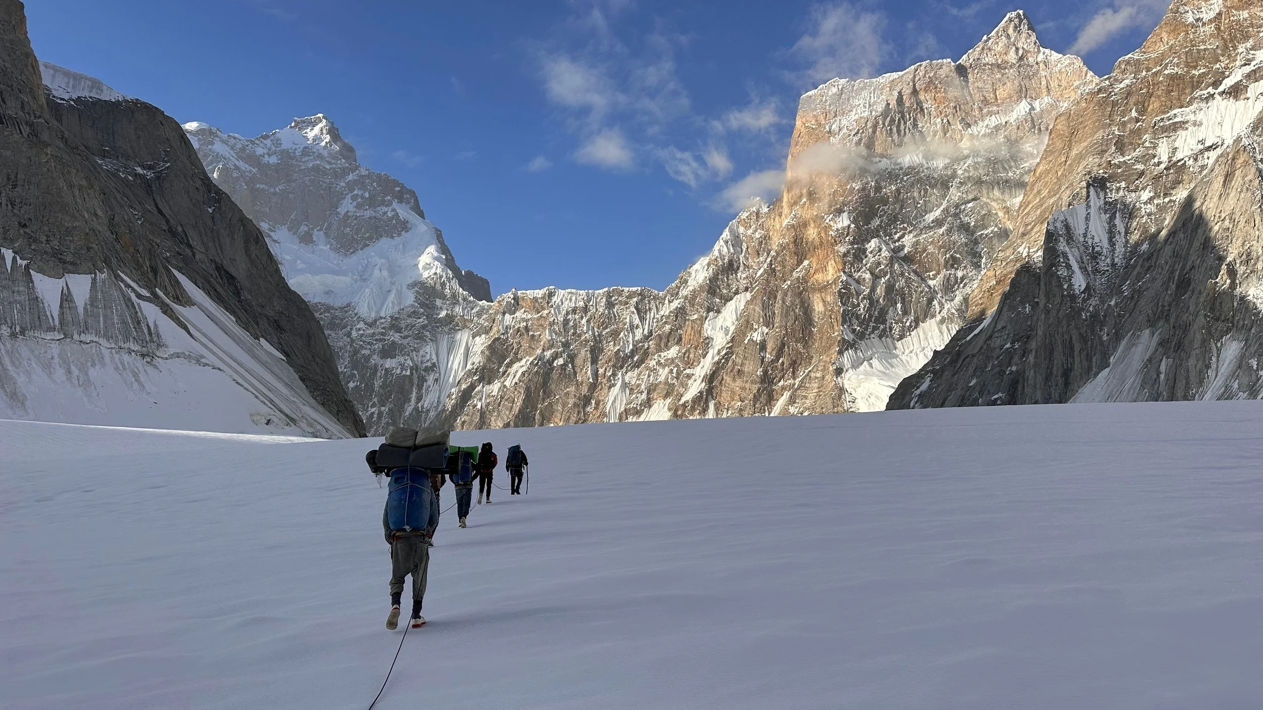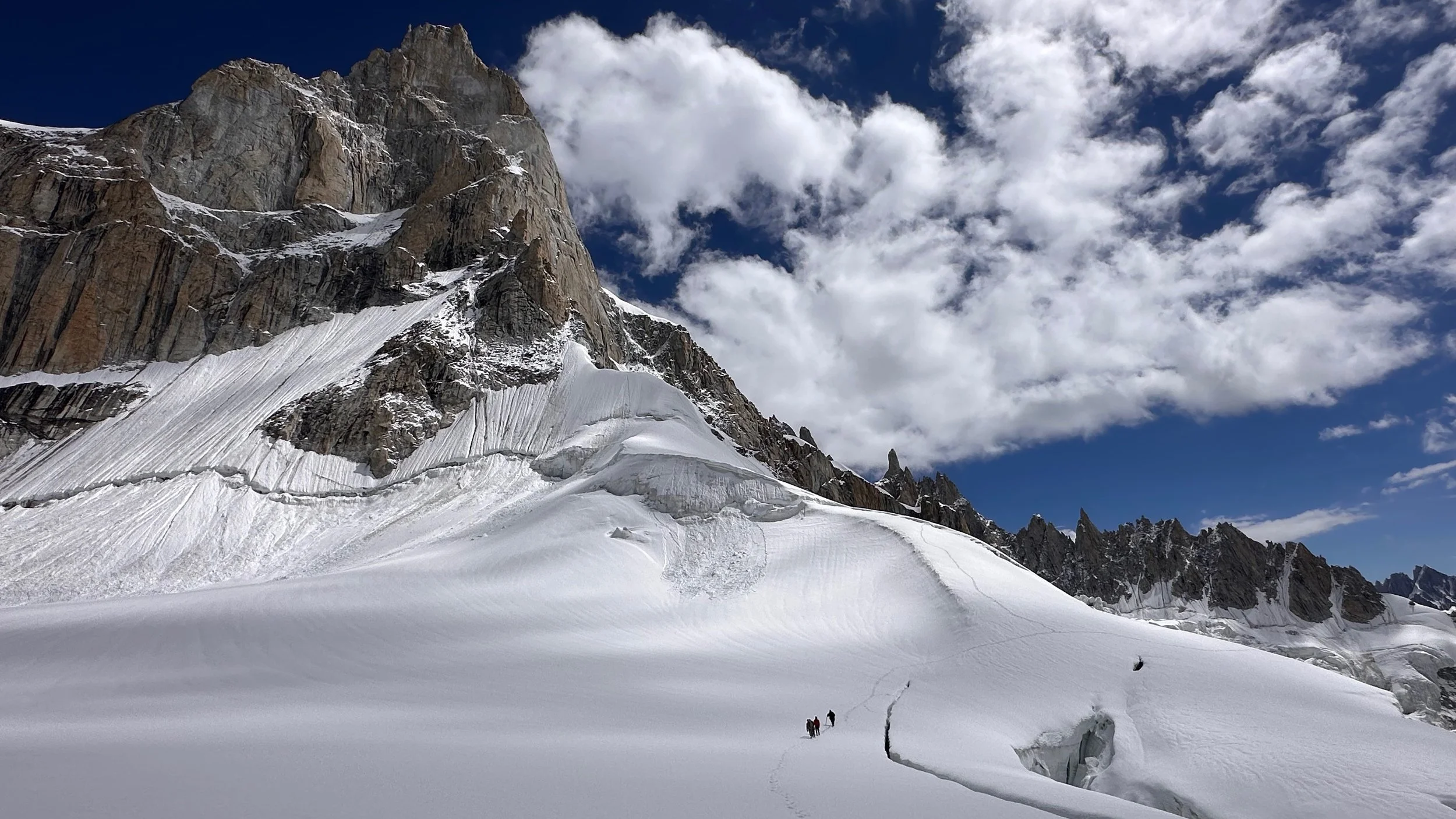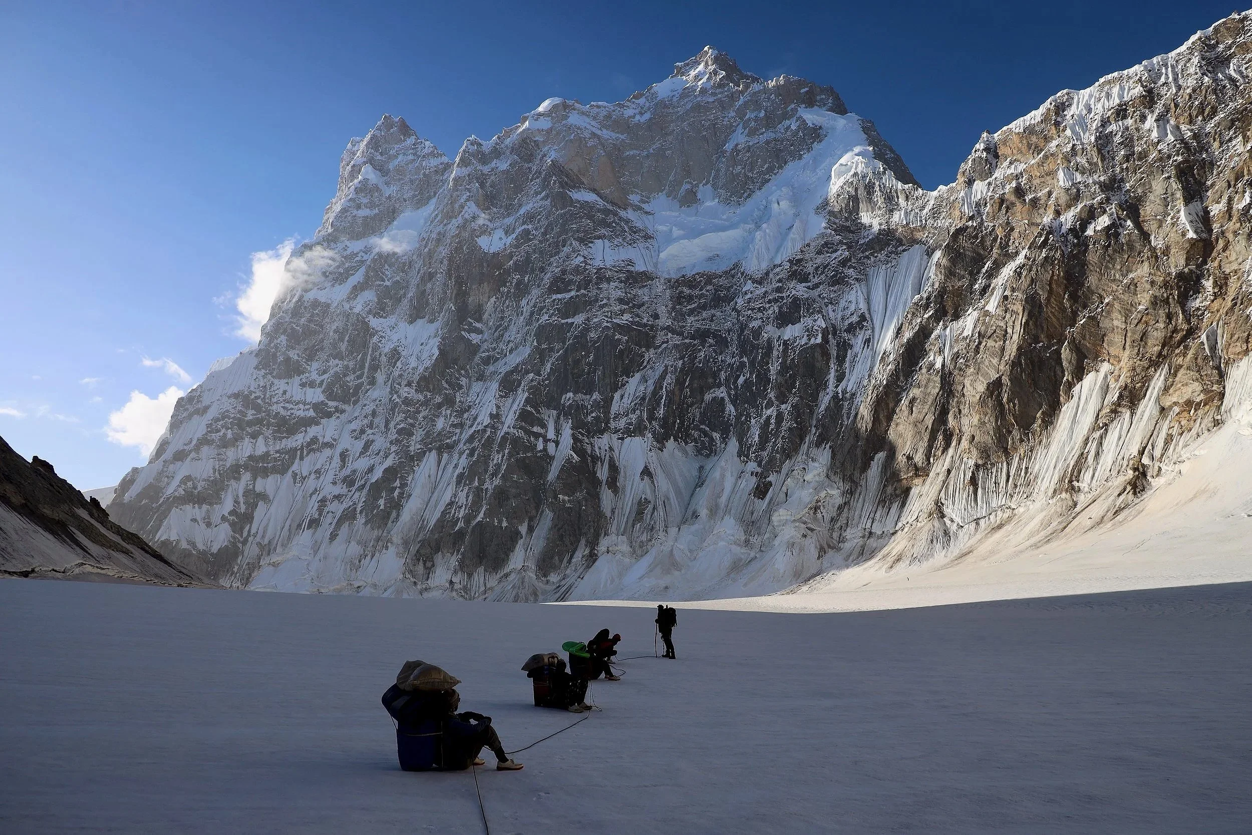 Looking for a way across the pass with Baintha Kabatha 6.270m towering above.