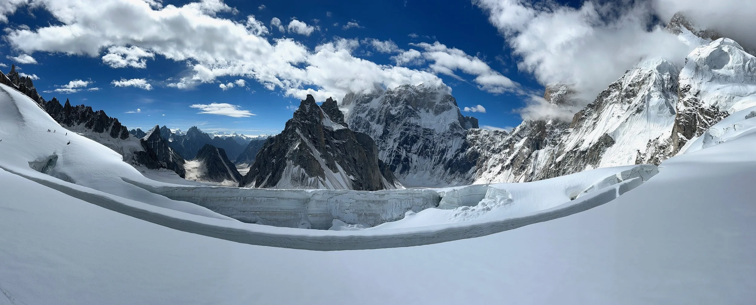 The upper Choktoi Glacier from the Sim La. It is a glacial cirque surrounded by Latok1, Latok2, Ogre 2, Ogre 1 and Baintha Kabata. It is hard to imagine a more spectacular setting!