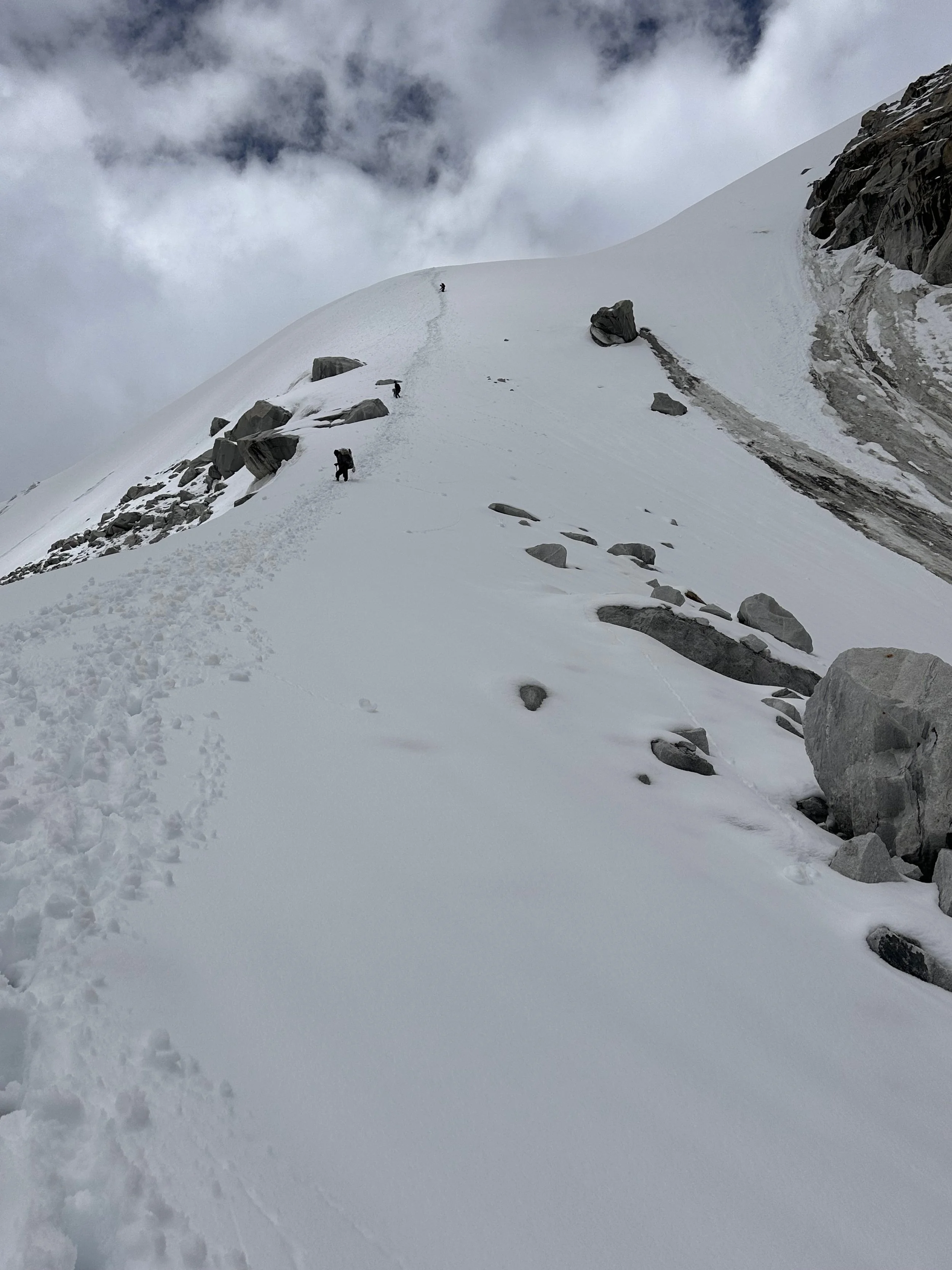 Descending steep Sim La. There are hidden crevasses under this snow! This is a glacier covered in a layer of snow.