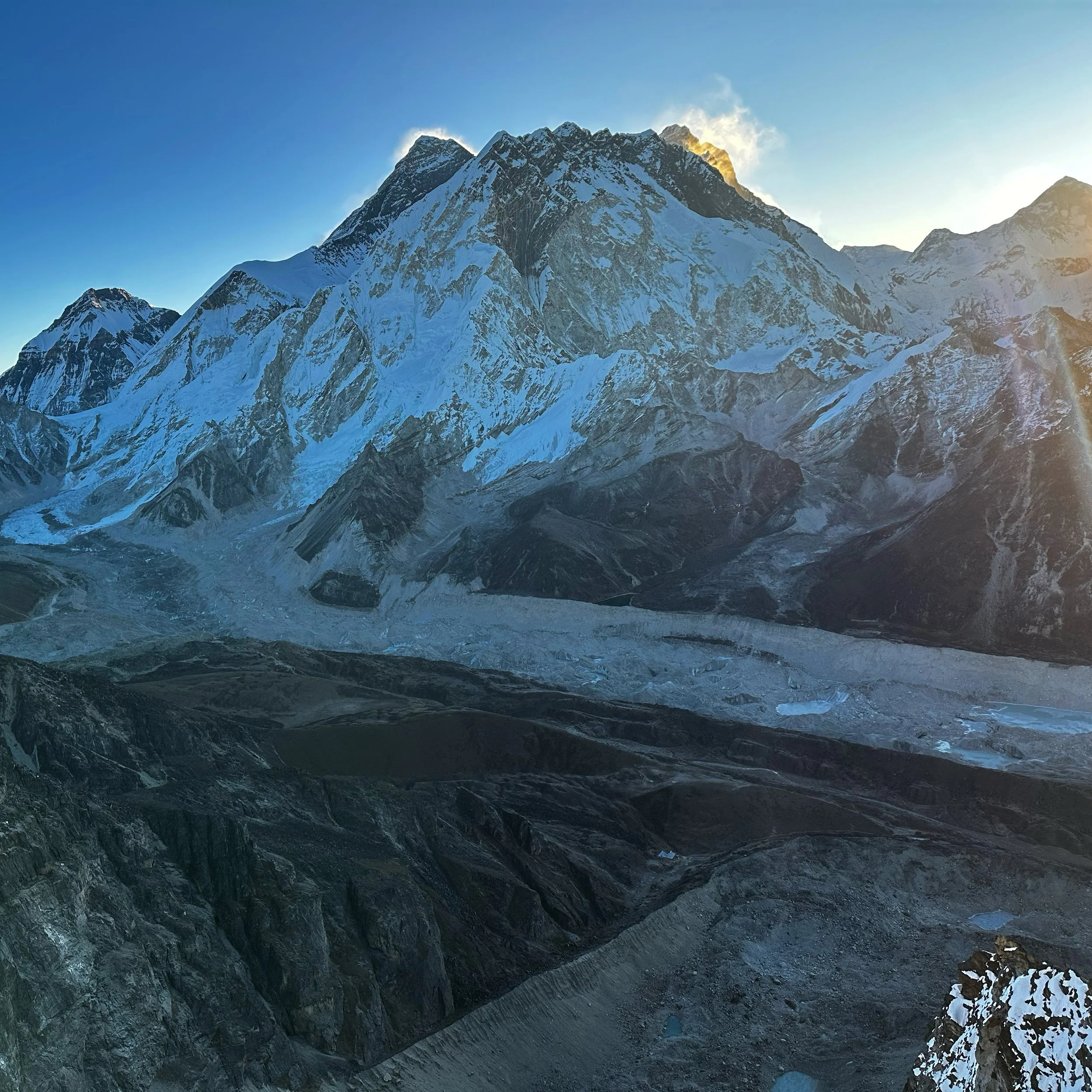 As the sun rose, the magnificence of our surroundings came to full view. I was looking at the panorama, but it did not feel real. I felt as if I was in a movie set and that the view was painted. It was absolutely stunning with the colors of the rising sun, from yellow sky above Ama Dablam, to shades of orange and full explosion of the rising sun from behind Makalu. The sun was illuminating the tops of higher mountains far in the distance all the way to Shisha Pangma. Everything looked so different in this early morning light. We had fantastic visibility and no wind. It is a very special time of the day, and it was very much worth the effort to be there for the sunrise. When the sun rose from behind Makalu it was truly magical. One of those moments that lingers in memory for a long time after. The view was truly alpine and impressive. Cholatse was so close and our elevation was not far from its summit. I was so happy to be there and to have made the last-minute decision to do this climb. The entire trip was all very unplanned, spontaneous and the final chapter, the ascent of Lobuche East exceeded my expectations, especially the sunrise. It felt very satisfying and special to be there.