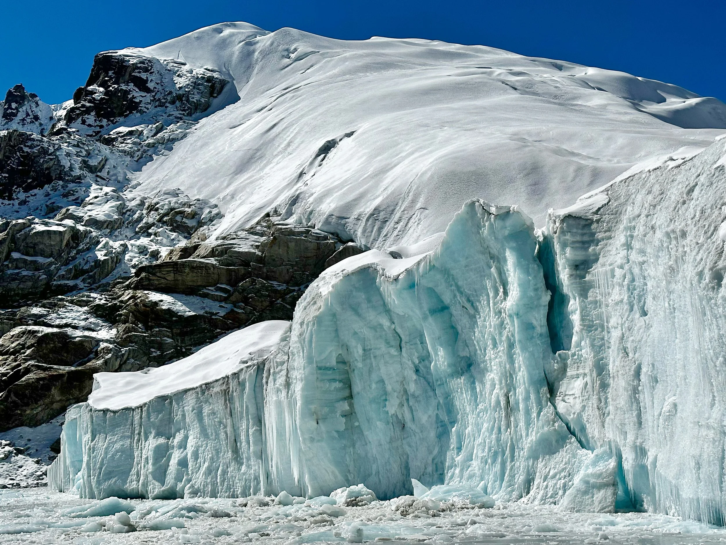 We turned a corner and another 6000m peak emerged in front of us. This peak towers over the basecamp for the Sumna Pass. From the moraine above the basecamp the view was even better. Long and massive glaciers and huge mountains surrounding them are visible all around. We could also see the Sumna Pass and the surrounding mountains that we would ascend the next day. It did not look as simple and easy as Tek was trying to tell me in Thame. Later, even he admitted that it was a good idea to hire the local help. Nima, our Sherpa guide climbed Everest 18 times, Cho Oyu 3 times and Kangchenjunga once. He lives in Thame with 4 kids and 12 yaks and is in his early 40s. He likes climbing and works for a US company called Madison Expeditions. He also works for a Nepali outfit called Pioneering Adventures which organized the winter Cho Oyu climb. He just returned from the attempt on the south face of Cho Oyu trying to establish a commercial route from Nepal as China is closed. He said that the Nepal side is very dangerous with avalanche danger and very steep. I felt quite ecstatic to be here among all the giants that I was looking at on Google Earth during forced covid internment. It was a magnificent spot and there was nobody there beside us. I hoped that our pass crossing was clear and safe.